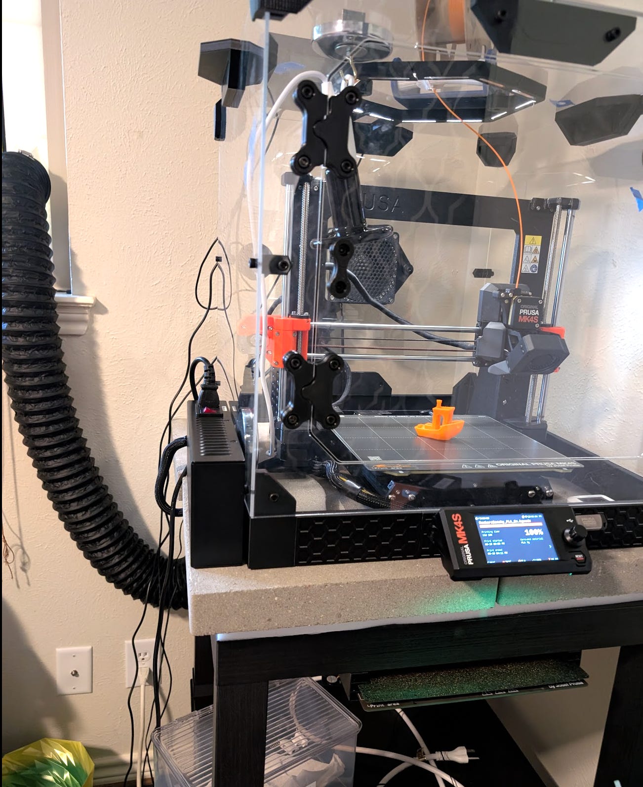 I can tell you how much I’ve spent, probably $1,500 and that’s including the enclosure and all the accutroments. The printer, a Prusa MK4S, was about $1,000. But that’s a pretty nice printer and Prusas are always more expensive for various reasons. A perfectly usable Bambu Lab A1 Mini is only $250 and the ABS-capable (more on that later) P1S is $550.