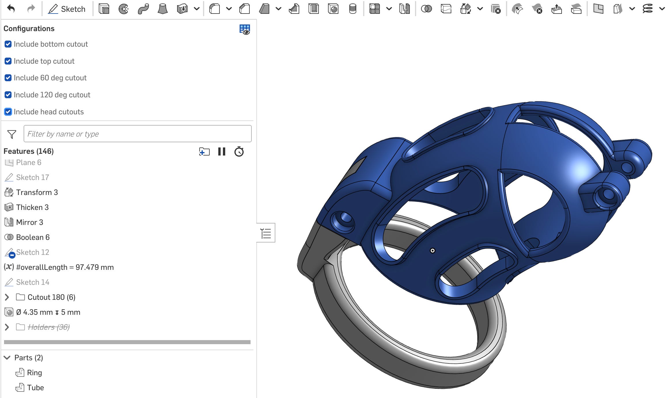 There are basically (as far as I know) two ways you can go with 3D modeling, CAD and mesh (polygon) modeling. I have never done mesh modeling but you can think of it like sculpting. With mesh modeling, you can easily get some very attractive and organic designs but you aren’t able to change them easily. For example, if you modeled a Cobra-like cage in Blender, the most popular tool for mesh modeling, and decided you wanted to change the size, you couldn’t just update a 60 to a 70 and it change. You would have to physically change the model. Whereas CAD is all about geometry and math. I can draw a circle and tell a CAD application like Fusion that that circle is 35 mm in diameter and then extend that circle into three dimensions to make a cylinder. I then can make the circle 40 mm and the cylinder will update. That’s called parametric CAD and if you want to play around with your cage’s sizing, that’s the way to go.
